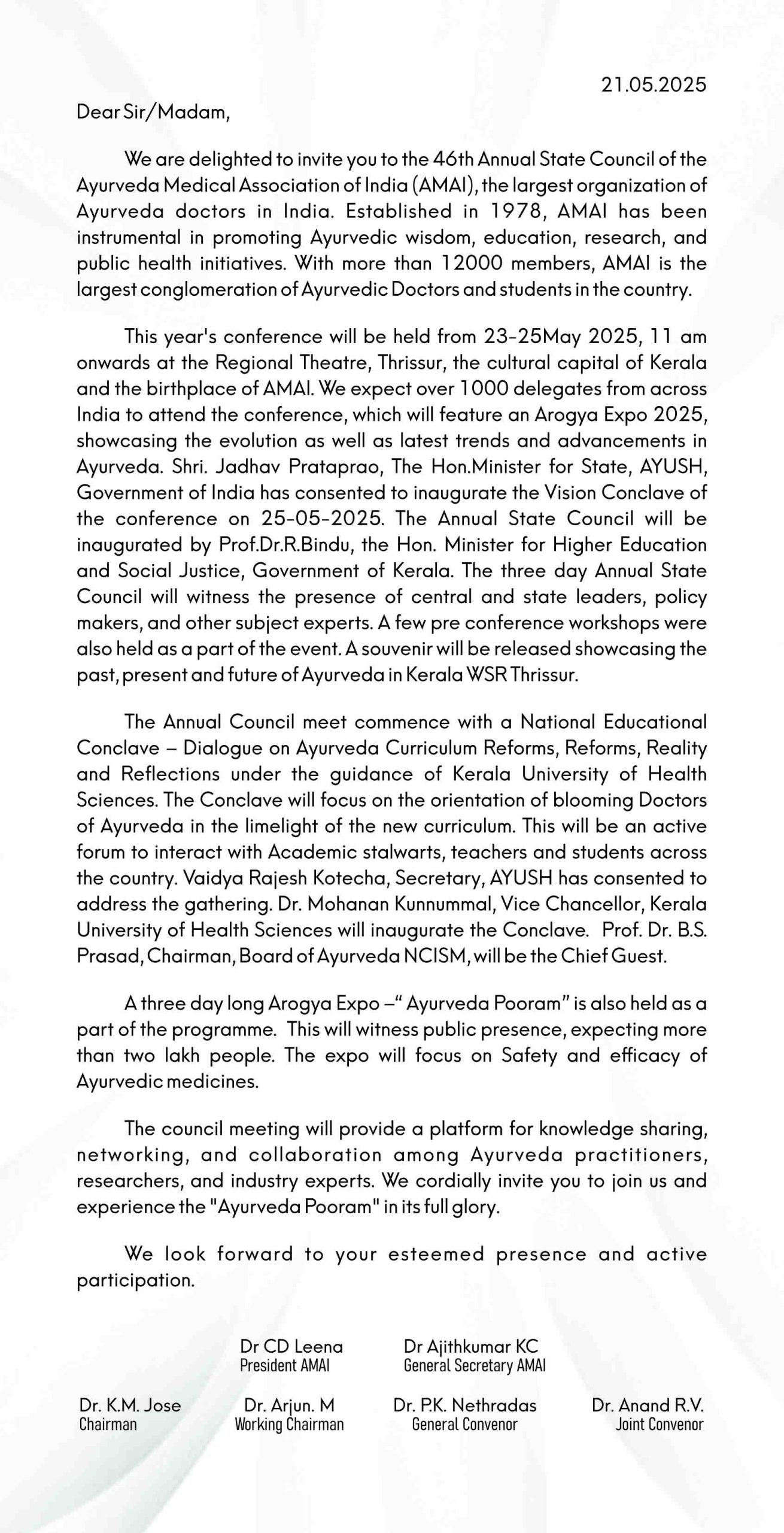 AMAI 17th State Conference 2021 March 28 Sunday Cardinal Parecattil Renewal Centre, Kaloor, Ernakulam Photo Courtesy: Dr. Benoy Bhaskaran, Vice Principal, Nangelil Ayurveda College