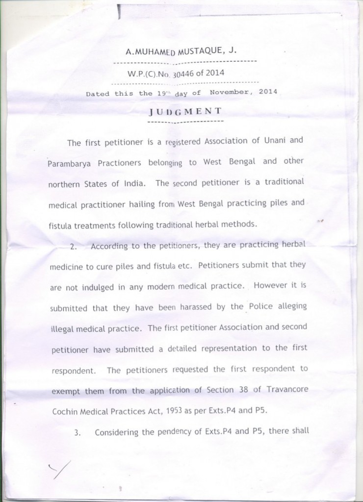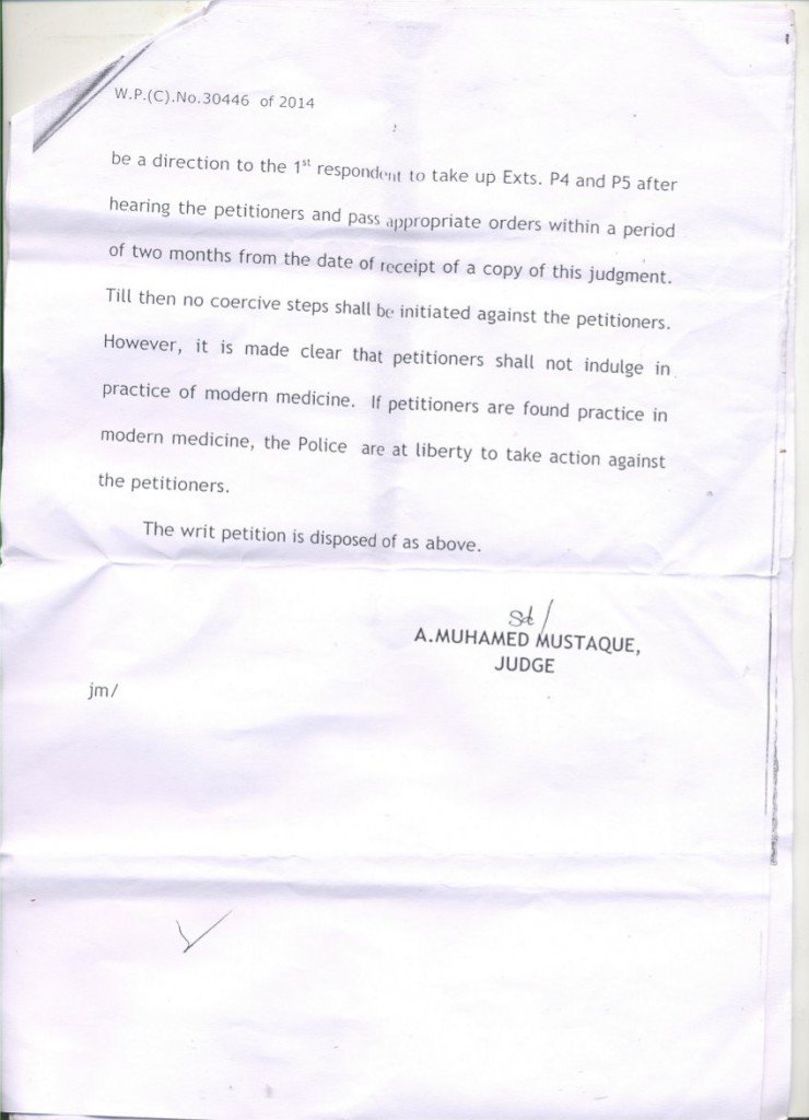 Please see the attachment. In this case we we filed a review petition and the court heard on 24-7-15.Submission made by the Government Pleader declared that Government rejected the application filed by the petitioner( Unani quack) The judge closed the review petitioner